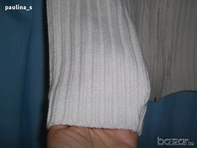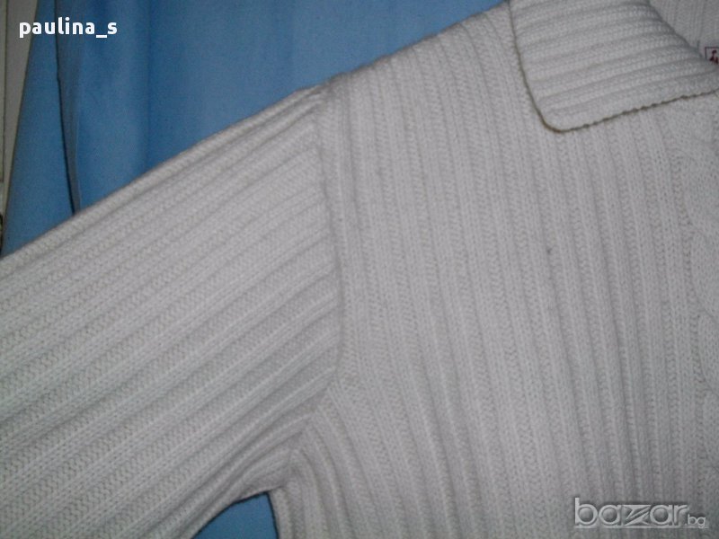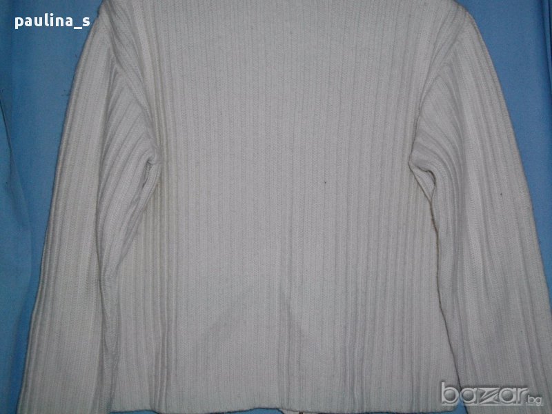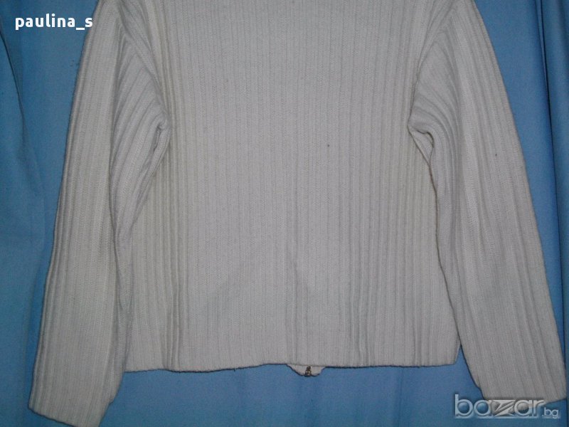 Дамска бяла жилетка като топ. Преждата е от 50% мериносова вълна и 50% акрил, с плетеници, яка и цип отпред! Моля разгледайте и другите обяви! При покупка за над 50лв, поемам част от доставката до офис на Еконт и правя отстъпка от общата цена, така цената за доставката не изглежда твърде непосилна. Приятно разглеждане. Продажбата е с благотворителна цел, цената е крайна. Благодаря за вниманието и отделеното време 🙂 Рамене 45см ГО 54см до 59см едностранно Талия 52см Ръкави 51см Дължина 54см