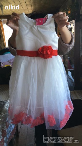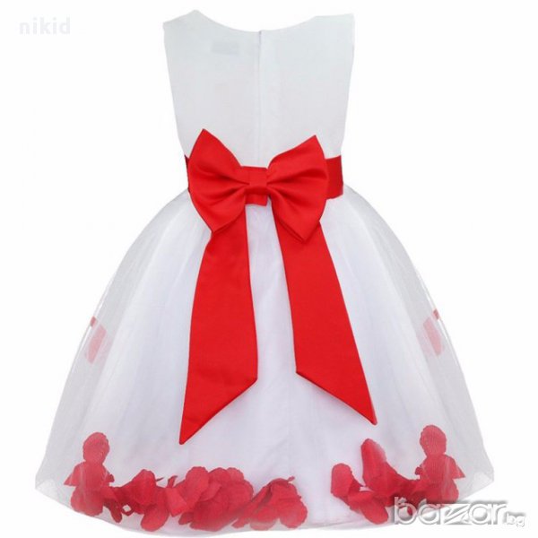 детска дълга бяла официална рокля с червени листенца роза и коланче → Обява 16300506