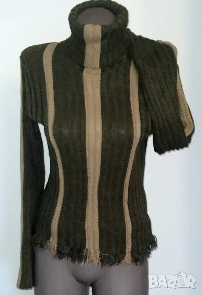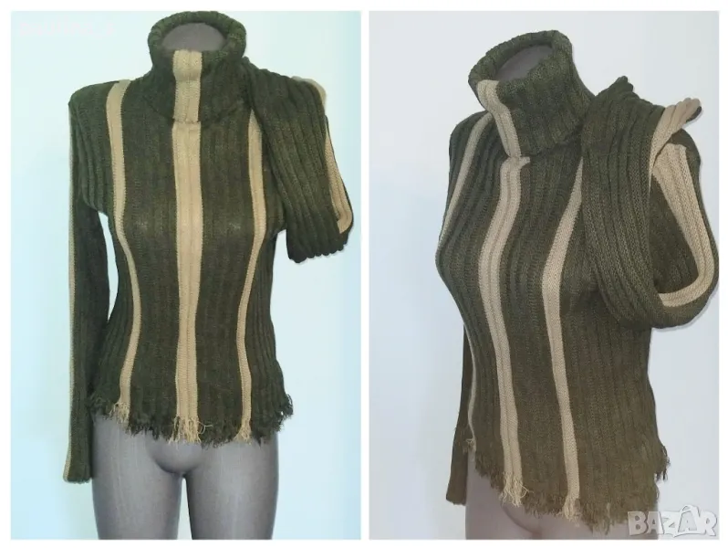 2️⃣. Колаж / L / 2XL / Зелен дамски пуловер с поло яка. Цената е крайна, без пазарлъци 29,99лв / 15 евро. Изплетен е в два цвята зелено и бежово, вертикални райета, долу завършва с ресни, ръкавите са като фунии, може да се носят и подгънати. Плетивото дава еластичност до 2ХЛ. Без дефекти, като нов. Преждата е със съдържание на акрил и не боцка. Една бройка е.