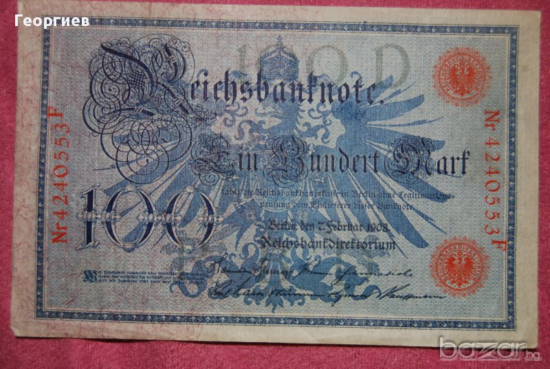 100 марки 1908 Германия червен печат → Обява 16383550