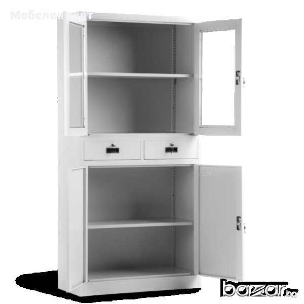 Металният шкаф за документи CR-1247 е модел с две отделения и две чекмеджета, всяко от които се заключва. В горния и долния шкаф има по 1 рафт с регулируема височина.