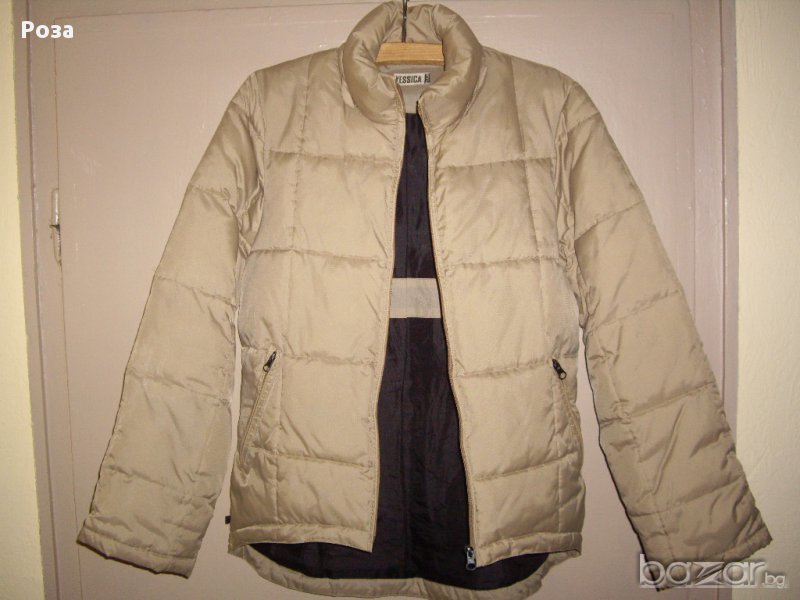 удължено, има вътрешен джоб с цип и е в приятен бежов цвят, който е по-ясен на втората снимка.Отговаря на размер 36-38 по ЕВР размер.Ширината на раменете е 42 см. Дължина на ръкава- 64 см. Дължината на гърба е 73 см...