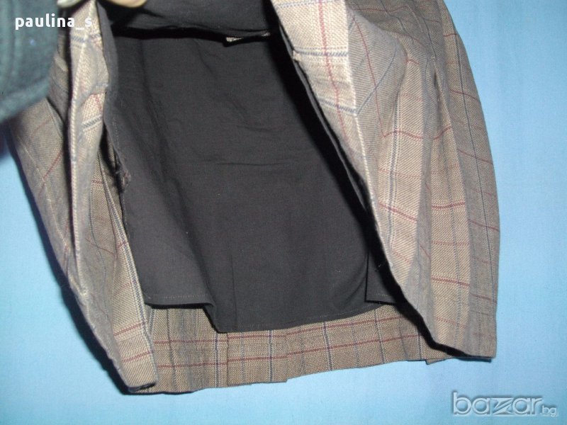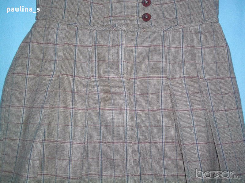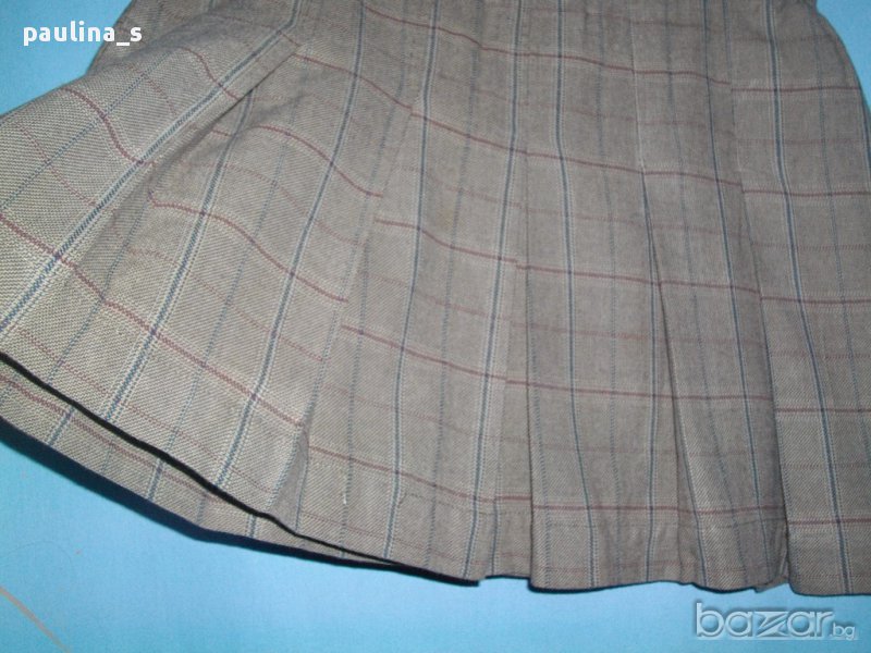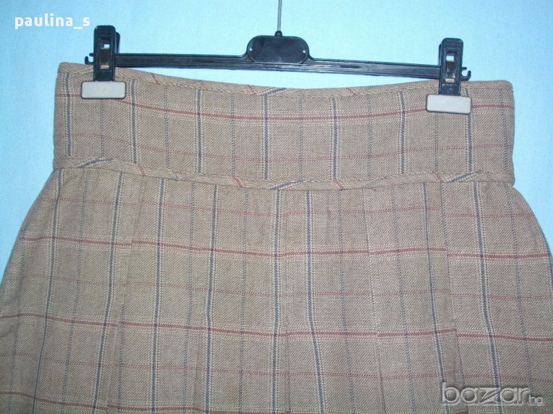Дамска пола в бежово каре с плисета. Отпред закопчаването е асиметрично с копчета и цип, хастарът е топъл.