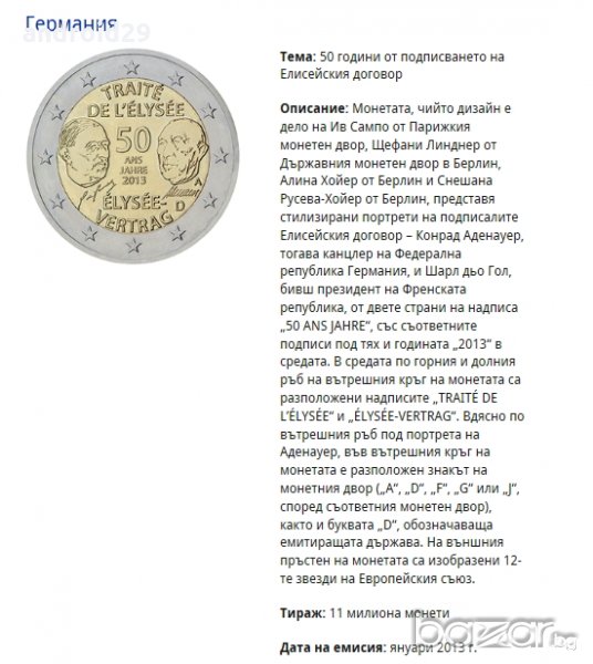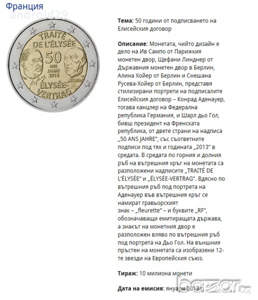 2013 3 Германия 2 EURO / F 50г. от подписването на Елисейския договор 9.80 лв. 5.01 €