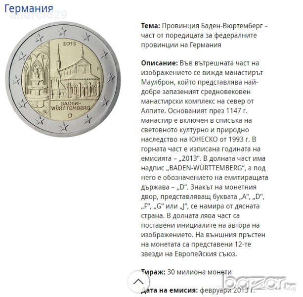 2013 9 Германия 2 EURO / F Баден-Вюртемберг: Манастир Маулброн 9.80 лв./5.01 €