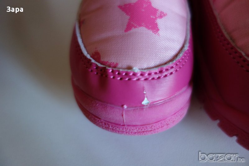 Ботушките са чисто нови и много красиви, с лепка отстрани. Имат 1 малка дупчица отпред, без да исках я направих с ножица. Тествах дали през нея пропуска вода - капах обилно отвън и за щастие не пропуска, вътре си остана сухо, то се пада върху други слоеве. Според мен е най-добре да се мацне с нещо, само за лак за нокти ми дойде наум, но сигурно има и по-подходящо средство.. Въпреки дефекта са хубави, подходящи за носене и все пак нови. Стелка 17см