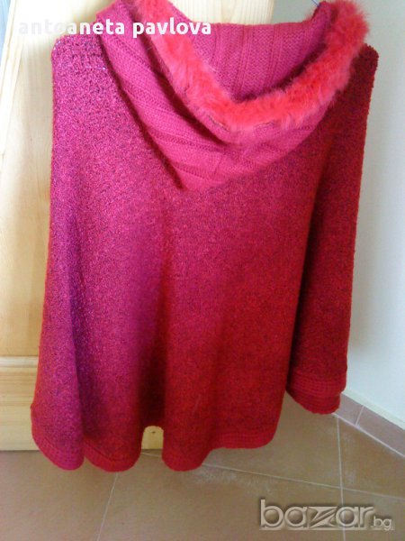 пончо за дама с гр об 116 - 125см , с качулка с пух , обличано само 2-3 пъти , материята е букле подходящо за пролетта