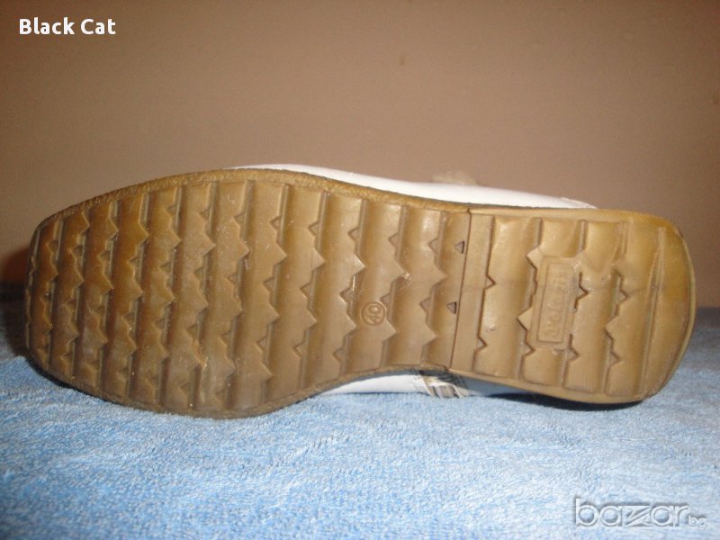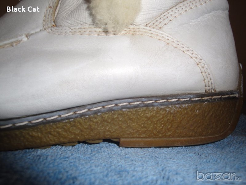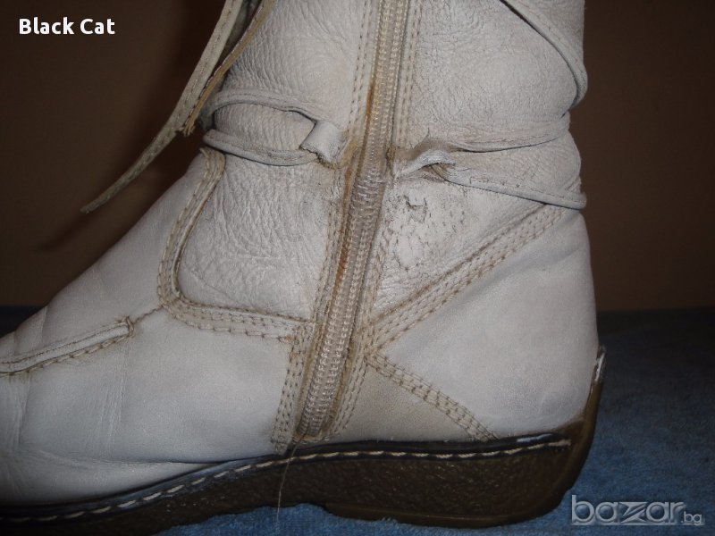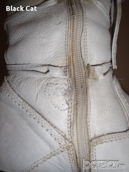 Състояние: Използвано, но ботушите са в много запазено състояние. Единствената видима забележка е лекото изтъркване / прежулване на гладката кожа от вътрешната страна на ботушите, само в долната част, в непосредствена близост до ципа; на единия ботуш има и малко по размер зашито място в същата област, но това е, на практика, незабележимо (забележките са показани детайлно на последните 2 снимки). Освен вече споменатите дефекти, ботушите нямат никакви други разлепени или скъсани участъци. Грайферът на подметките е отлично съхранен (показано е на тринадесетата снимка). Ботушите са почистени идеално и са третирани еднократно с бяла боя за обувки, с цел освежаване на цвета