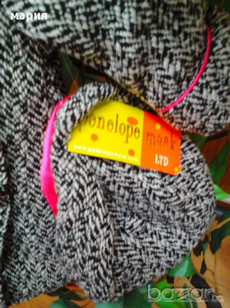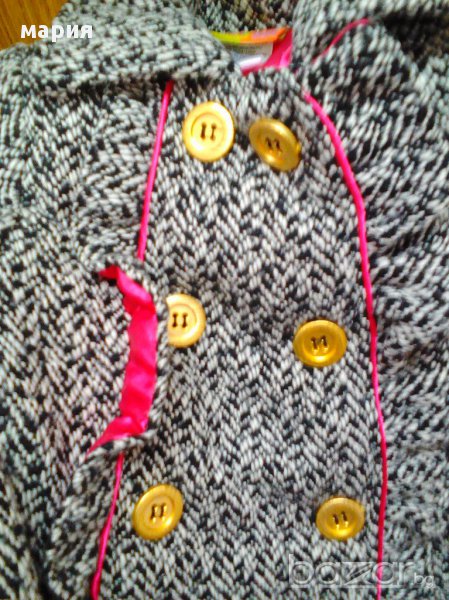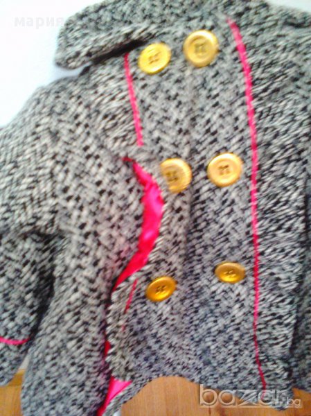 Палтенцето е леко разкроено т. е не е право .Има и две джобчета.Двуредно закопчаване със златисти,матирани копчета.Единият ред са декоративни .Покрай тях е леко набрано. На живо е много красиво.