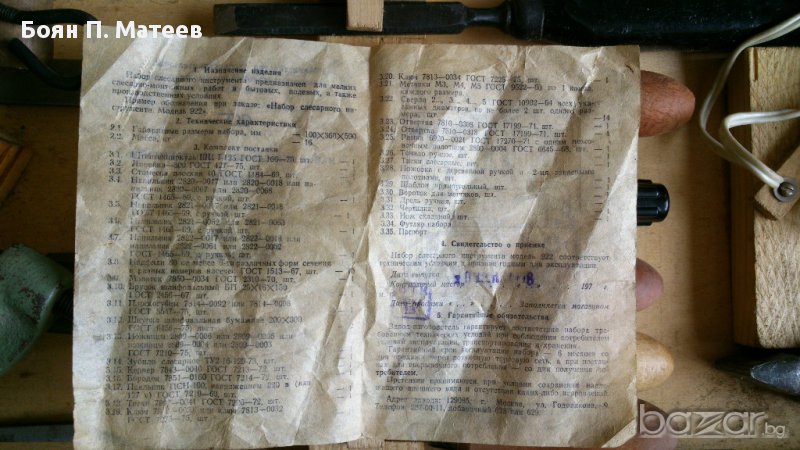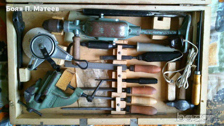 Ретро комплект инструменти от бившия СССР. Някои от инструментите са използвани, други са нови. Комплектът е пълен, всички инструменти са абсолютно изправни. Оригинално дървено куфарче и паспорт, подпечатани. Цената е хиляда лева.