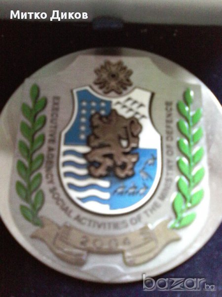 На плакета пише -executive agency social activities of the ministry of defence-тоест за мене преведено е на някаква социална агенция към министерство на отбраната -на коя страна е не знам-може би е на България-размери на кутията 9см на 9см на 4см и диаметър на плакета-6см-изпращам по еконт с отстъпка
