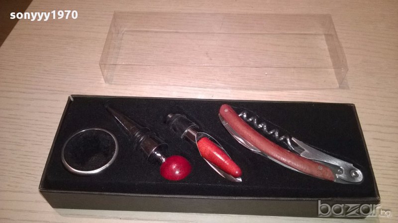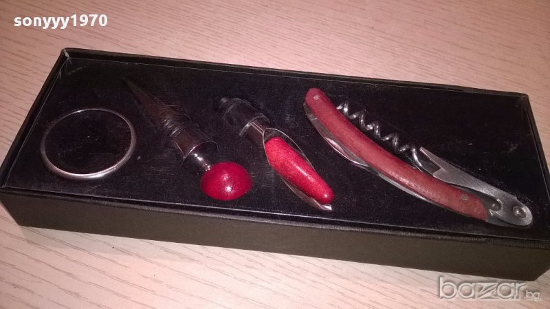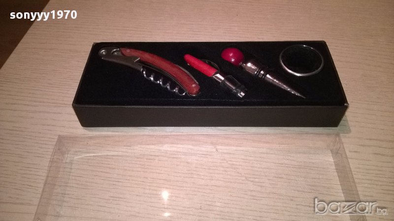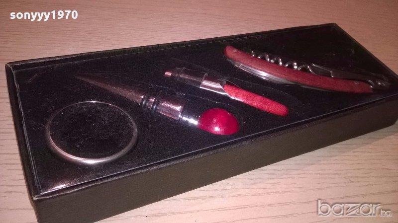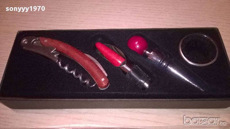 Нов комплект за вино в кутия с размер 24/9/3см...Комплект за вино, състоящ се от тапа, тирбушон, лиек и ринг. Предлага се в луксозна кутийка. Размери на кутията: 24х9х3см-от днес 28.02.22г пращаме със спиди или еконт с преглед и тест след превод на капаро за куриерската услуга поради зачестили некоректни потребители-поръчки само в тук в саита! по телефона и със смс не! краини цени! бартери не правиме! всеки ден нови неща-още над 18000 обяви тук
