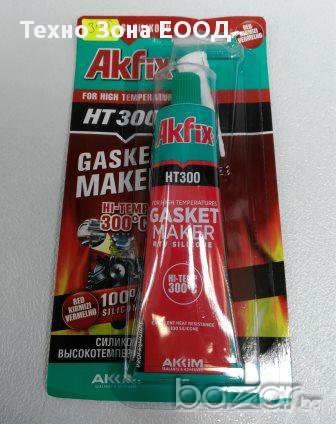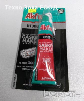 Приложение и свойства: Akfix RTV HT300 е еластичен, ацетатен, бързовтвърдяващ се силикон с широк спъктър на приложение при уплътняване на помпи, скоростни кутии,мотори, климатични системи. Подходящ за всички нужди, където работната температура достига 300° С. Устойчив на вода и масла след втвърдяване.