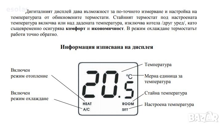Дигиталният дисплей дава възможност за по-точното измерване и настройка на температурата от обикновените термостати. Стайният термостат под настроената температура включва или над дадената температура, изключва котела /друг уред/, като същевременно осигурява комфорт и икономичност. В режим охлаждане термостатът работи точно обратно.