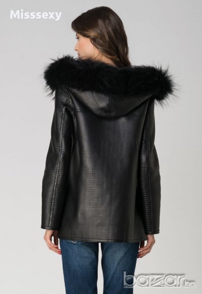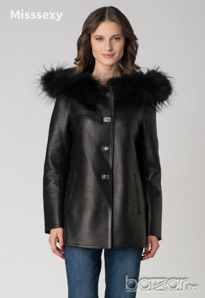 Уникално черно кожено яке с качулка козина на енот и подплата от вълна.