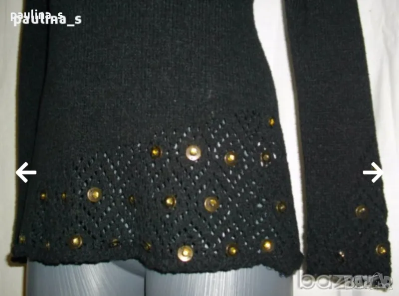 3️⃣. XL / 3XL - Черен копринен пуловер тип туника с декорации и поло яка "Guden triko" Turkey. Цената е крайна, без пазарлъци 15 евро. Декориран копринен пуловер с поло яка. Състав на преждата ацтатна коприна, памук и ликра-еластичен, покрива няколко размера, посочени са. Асиметрично плетиво с дантелен акцент, впечатляваща и практична дреха, не се мачка и е много приятна за допир до кожата. За ценителки на декорации.