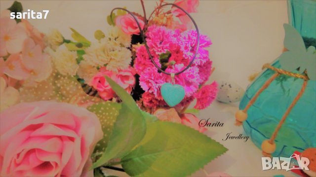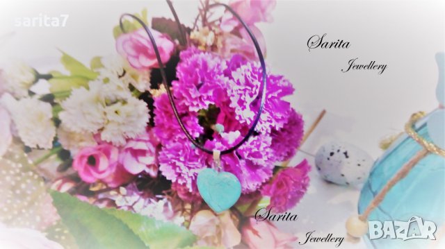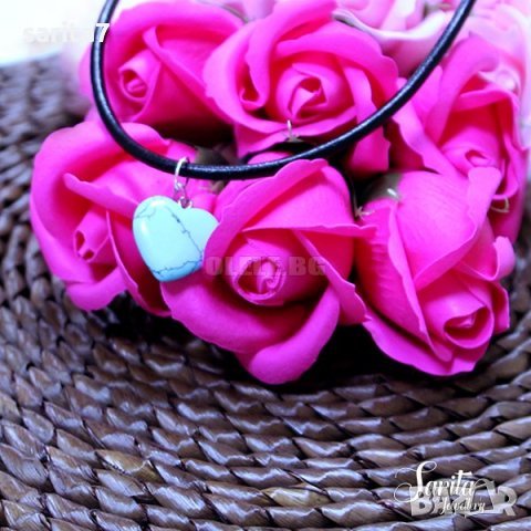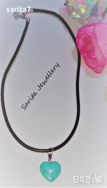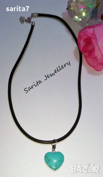Дамско колие със сърце от тюркоаз и черна кожена верижка.