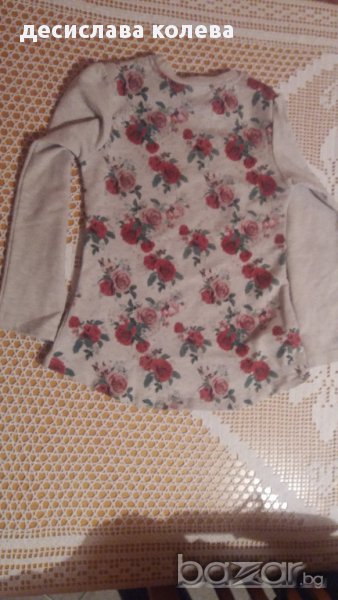 Блузката е използвана, но без забележки по нея. В бежов цвят на сиви черти с момиче на гърдите , с надпис. На марката Чичлид - 6-7 год. Размерите са : гръдна - 30 см., дължина на ръкава - 41 см., обща дължина на предницата - 45 см, а на гърба - 50 см. Гърбът е на червени рози.