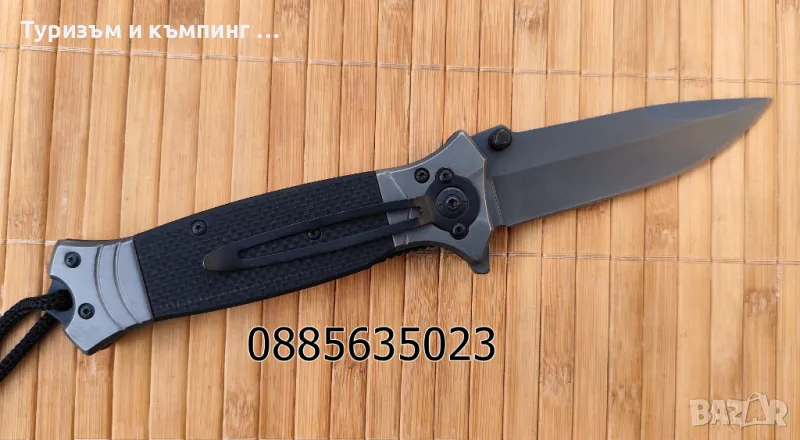 Полуавтоматичен нож с танто острие.При леко натискане на петлето в задния край острието веднага се разтваря в крайна позиция.