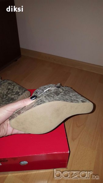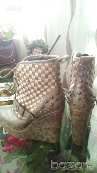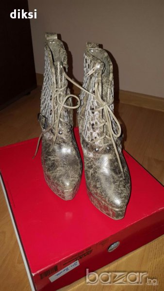 Дамски оригинални боти номер 37,5 естествена кожа, цвят златистосребристи, височина на тока 11 см., височина на платформата 2,5 см.
