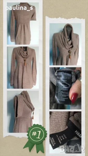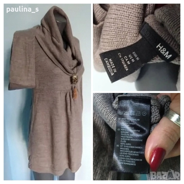 1️⃣. Колаж / M / XL - "H&M". Цената е крайна 19,99лв / 10 евро. Сезонна маркова туника от плътно плетиво - акрил. Материята е мека, еластична и приятна за допир до кожата; има еластичност и покрива няколко размера; една бройка е. Колието с бухал е на цена 6,99лв / 3,5 евро, предпочитам да не се делят!