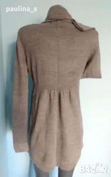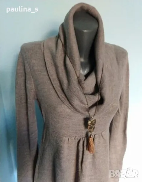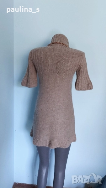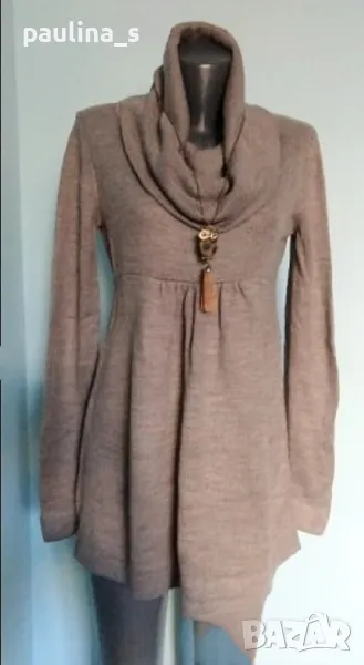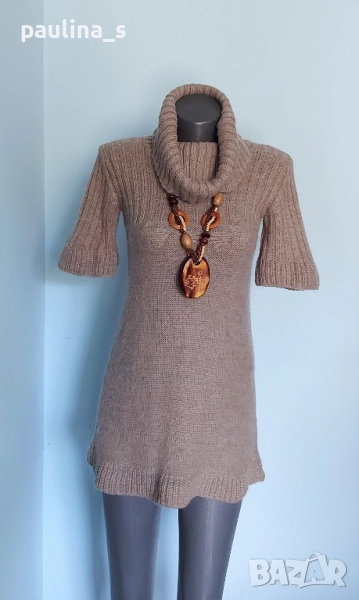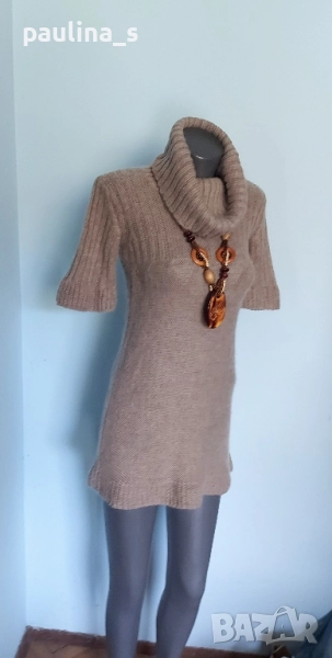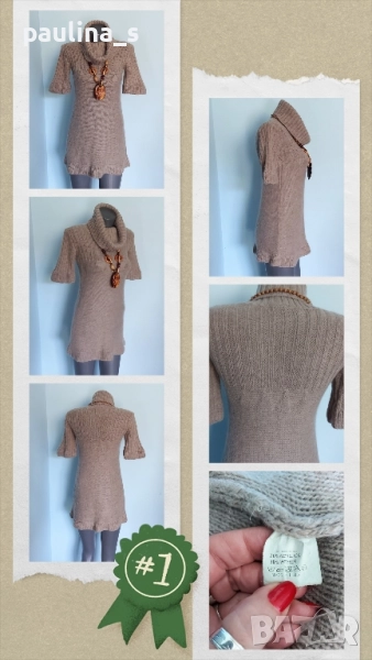 2️⃣. Колаж / S / XL - Италианска Мохерна туника или къса рокля. Цената е крайна 19,99лв / 10 евро. Има богата поло яка. Винтидж модел от 2004 година. Цветът е неутрален, подхожда на всичко. Прежда-мохер и акрил, дава еластичност и покрива 3 номера от S до L(40EU), не се степва при пране! Под бюста разширението е за сметка на вплетени ластици отвътре, образуващи набор. Моделът е специален и оригинален. Една бройка е, без дефекти и етикет. Колието е ръчна изработка - Цената е крайна 19,99лв / 10 евро. При желание също се продава.