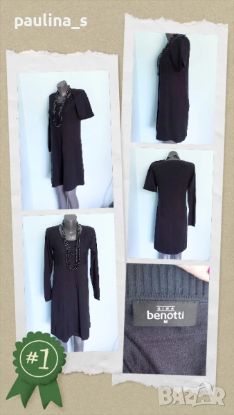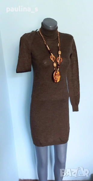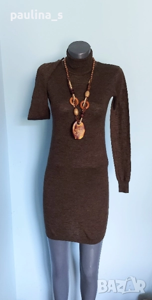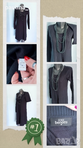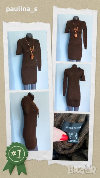 3️⃣. Колаж / S / XL - "Atmosphere". Цената е крайна, без пазарлъци 29,99лв / 15 евро. Рокля тип туника с дълъг ръкав и поло яка, универсален размер. Една бройка е, от фино машинно плетиво, в меланж - Черно, медено и кафяво. Състав 50%памук, 50%акрил - хипоалергична, с идентификационен номер. Моделът е с поло яка и втален класически силует. Покрива дрескода за офис или повод с подходящо бижу, колието е ръчна изработка - Цената е крайна 19,99лв / 10 евро, също се продава. Има еластичност и прозрачност, става за посочените размери.