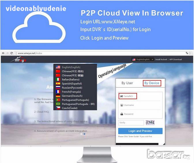 Cloud Technology: Облачната технология позволява да виждате двр-а и съответно камерите, вързани към него от всяка интернет точка от цял свят и от всеки смартфон от цял свят, без да имате реално ай-пи и някакви специални настройки, без значение зад какъв Firewall седи устройството! (P2P Cloud функция xmeye.net)
