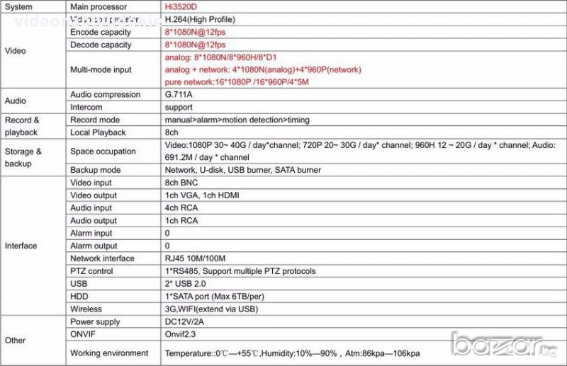Съхранение и архивиране на информацията: 1080p 30~40G/ден*канал; 960H: 12~20G/ден*канал; 720P: 20G/ден*канал; Аудио:691.2M/ден*канал