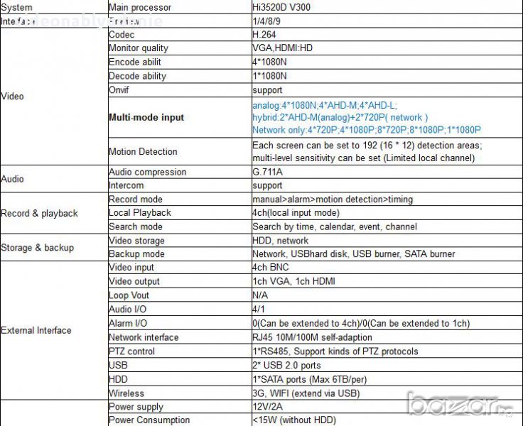 Декодиране: 4 * AHD-M / 720p / 1080N /960H / IP 720p/ IP 960p / IP 1080p