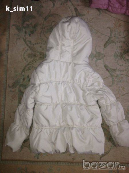 Next зимно яке за 5-6 г. Цвят кремаво, закопчава се с цип и копчета, 2 джоба, всички набори са ластични, качулката не се откача. Якето е с дебела вата и е топло. Много добро състояние. дължина 50 см. ширина подм. 36/42 см. ръкав 41/33 см.