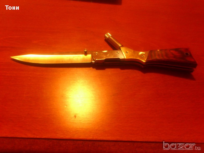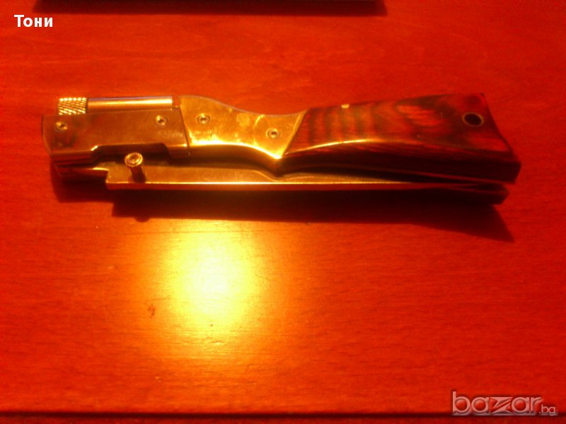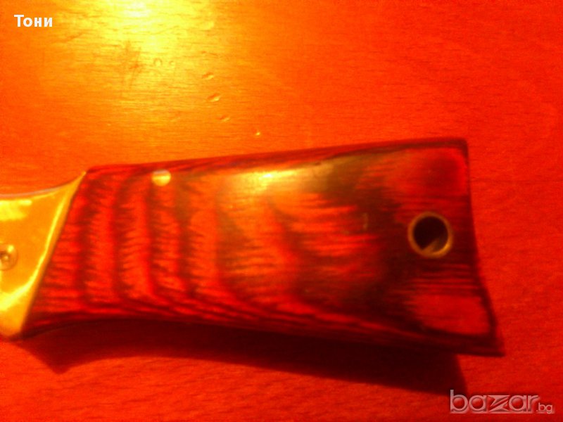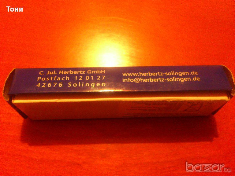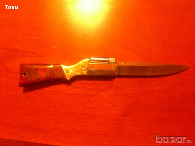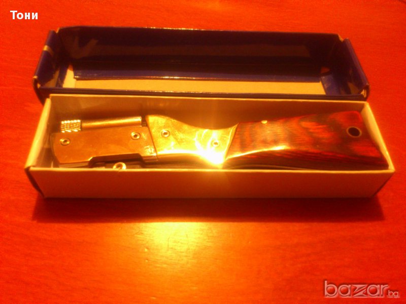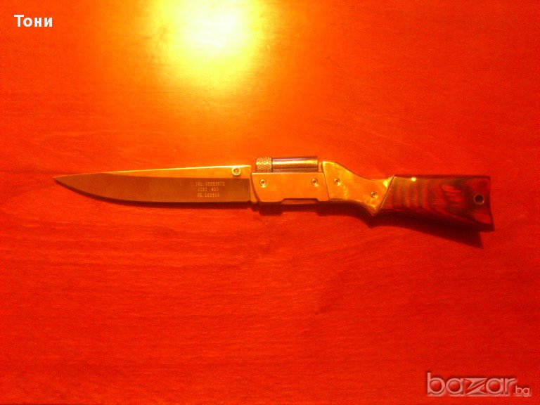 Сгъваем нож C.JUL.Herbertz AISI 420 nr 162613 .Нов в кутия.Направен под формата на пушка.Има LED фенерче с четири батерии AG 3.Острие- полирана неръждаема стомана,дръжка- никел сребърен и дърво.Размери острие 11.5см,дръжка 13.5см,общо 25 см.196гр.