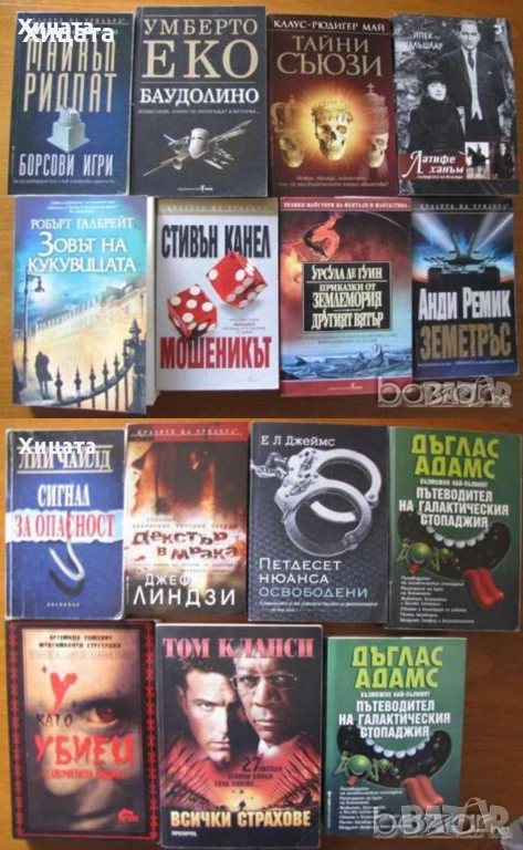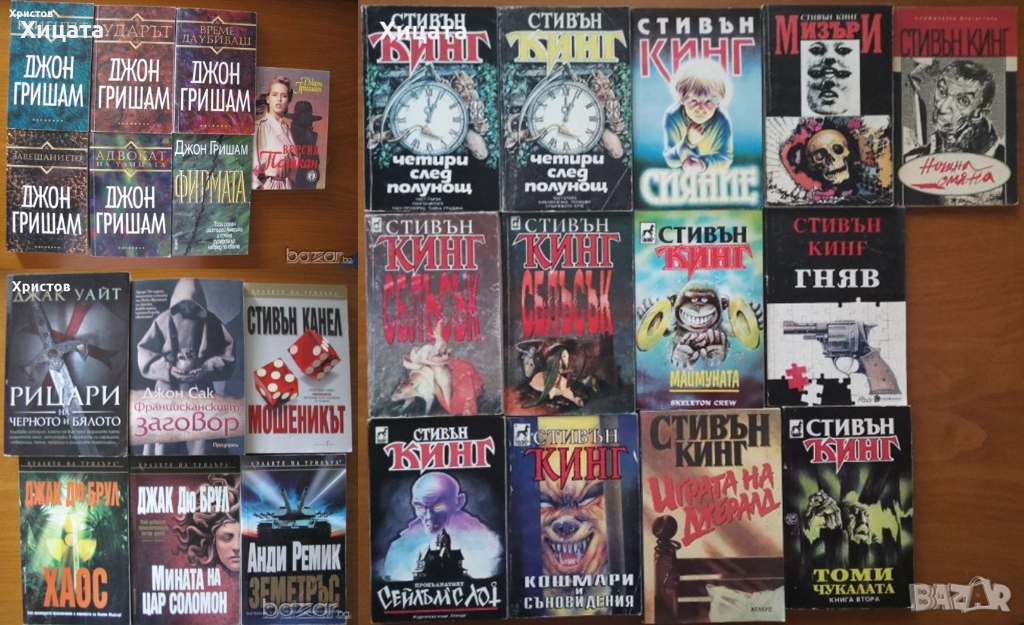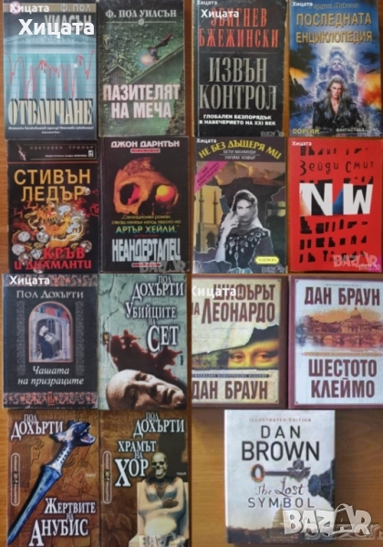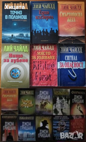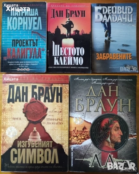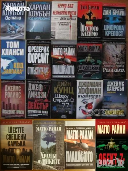 Проектът "Калигула",Патриша Корнуел - 25лв.Забравените,Дейвид Балдачи - 25лв.Шестото клеймо книга,Дан Браун - 15лв. Изгубеният символ,Дан Браун - 17лв.Ад,Дан Браун - 17лв.Не без дъщеря ми,Бети Махмуди,Уилям Хофър,Златорогъ,1992г.368стр- 20лв Последната енциклопедия,Гордън Диксън,Орфия,2003г.366стр. - 20лв NW,Зейди Смит,Жанет-45,2014г.396стр.Отлична! - 15лв Извън контрол,Збигнев Бжежински,Обсидиан,1994г.240стр. - 22лв Сингъл & Сингъл,Джон Льо Каре,Унискорп,2005г.480стр. - 20лв.Лекари,Ерик Сийгъл -30лв. Загадката "Халидон",Робърт Лъдлъм,Прозорец,2005г.432стр. - 20лв. Обвинена в убийство,Марк Хименес,Обсидиан,2010г.416стр - 20лв Майкъл Конъли:Плашило - 30лв.Петата поправка - 30лв.Рисковете на професията,предишното издание - 15лв.Лий Чайлд:Точно в полунощ -30лв.Смъртоносна жега - 20лв.Един изстрел - 20лв.Сигнал за опасност-20лв..Нищо за губене -20лв.Място за убиване -20лв .Уилбър Смит: Седмият папирус.Том 1-2,1995г.710стр.- 50лв Чародей 2003г.616стр. - 50лв Речният бог.Книга 1-2,1994г.718стр. - 50лв. Нелсън Демил: Играта на лъва-25лв. Полет 800 -25лв.Златният бряг- 25лв.На север - 25лв.Обречен на мълчание.Книга 1-2 - 50лв.Мейдей,Нелсън Демил,Томас Блок - 50лв. Джон Гришам : Кралят на исковете-25лв.Завещанието-25лв.Признанието - 20лв.Сянката на чинара-30лв.Рекетьорът-26лв.Брокерът - 25лв.Изнудването-20лв.Обжалването-20лв.Фирмата-20лв.Братята - 20лв.Дейвид Балдачи:Кинг и Максуел-25лв.Шестият -25лв.Ден нула -25лв.Невинните -25лв.Последният жив -25лв.Игра на часове - 25лв. Колекционерите - 25лв.Да спасиш свидетел-20лв. Книги,Матю Райли- 25лв/брой! Книги на Стивън Кинг : Другият,твърди корици - 33лв Кошмари и съновидения - 25лв. Томи Чукалата. Книга 2.Сказание за Хейвън - 20лв.Сияние - 15лв. Сейлъмс Лот - 20лв; Играта на Джерард - 15лв; Маймуната -20лв. Мизъри - 20лв. Четири след полунощ. Част 1-2 - 30лв. Нощна смяна - 20лв. Черно-бял и безвъзвратно мъртъв,Джон Дарнтън -20лв.Егати животът,Ник Хорнби,Кръгозор,2001г.284стр. - 50лв Ларва,Джон Фаулз,Парадокс,1993г.432стр. - 30лв Латифе Ханъм,Ипек Чалъшлар - 40лв."У" като убиец. Всемирна история на серийните убийци.Американски килъри,Артемида Сенкевич, Максимилиан Стругацки - 70лв.Баудолино,Умберто Еко-30в. Написано с кръв.История на съдебното разследване,Колин Уилсън, Деймън Уилсън - 90лв; Неразгаданите мистерии,Колин Уилсън, Деймън Уилсън - 50лв.Звезден прах,Нийл Геймън - 50лв;.Вуду в черепа,Майкъл Грубер - 50лв.Изчезналото Евангелие,Хърбърт Кросни -60лв.Надпревара за Армагедон, Майкъл Бейджънт-60лв.Децата на новото хилядолетие,Ян ван Хелсинг-60лв.Наследството на Моисей,Греъм Филипс -50лв. Рицари на черното и бялото,Джак Уайт - 60лв. The Lost Symbol Illustrated edition ( Изгубеният символ) Dan Brown - 60лв.Югославската драма,Михайло Црънобръня,Арго Пъблишинг,2005г.432стр. - 50лв. Студена планина,Чарлз Фрейзър,Intense,2004г.400стр. - 50лв. Сянката на Берлускони,Дейвид Лейн,Изд.Ера,368стр.2005г. - 35лв. Залезът на демокрацията,Глен Бек,Издателство. СофтПрес,2011г.344стр.Отлична! - 15лв.Сблъсъкът на цивилизациите и преобразуването на световния ред,Самюъл Хънтингтън,Обсидиан,1999г.528стр.-40лв.