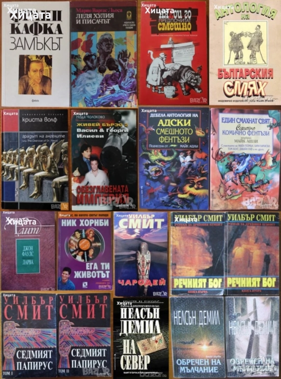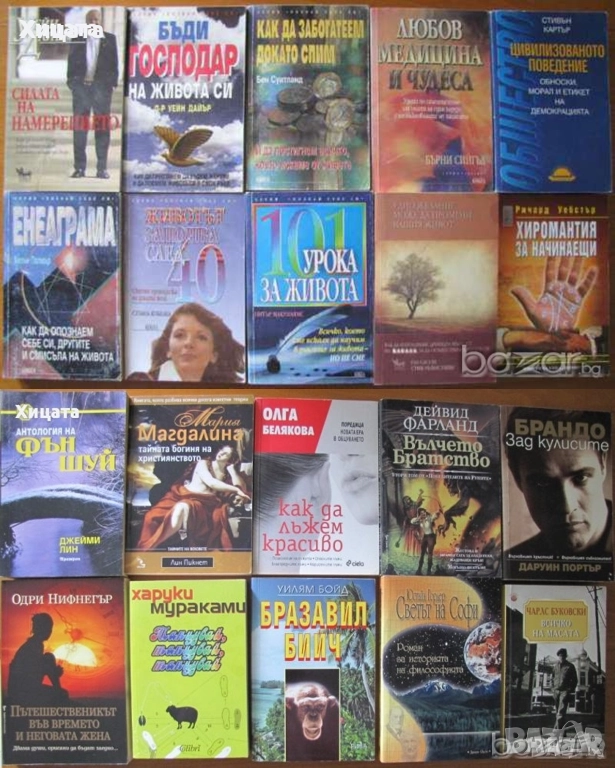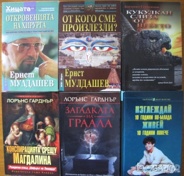 Конспирацията срещу Магдалина,Лорънс Гарднър,Хермес,2006г.400стр. - 50лв. Загадката на Граала,Лорънс Гарднър,Хермес,2010г.432стр. - 50лв.От кого сме произлезли?,Ернст Мулдашев,2003г.432стр. - 15лв. Кукулкан слиза от небето,Богомил Герасимов,Труд,2012г.368стр. -20лв. Изглеждай 10 години по-млада.Живей 10 години повече,Д-р Дейвид Рибак,Аратрон,1998г.464стр. - 50лв.Замъкът,Франц Кафка,Фама,1993г.328стр. - 25лв.Леля Хулия и писачът,Марио Варгас Льоса,Христо Г. Данов,1981г.374стр. - 25лв.Живей бързо.Книга 2:Обезглавената империя,Надя Чолакова, Милениум,2007г.294стр. - 15лв Градът на ангелите,или The Overcoat of Dr. Feud, Криста Волф,Лeтера,2012г.416стр.- 20лв Властта на тайните общества през ХХ век или защо човек не управлява света - том 1,Ян ван Хелсинг,Оргон,2009г.336стр. - 60лв Банки, хляб и бомби,Щефан Ердман -50лв. Тайните на Неразгаданите мистерии,Колин Уилсън,Деймън Уилсън - 50лв. Мъдрата обич,Марта Пийпър,Уилям Пийпър - 75лв.Синдромът,Джон Кейс,Бард,2002г.450стр. - 35лв. Ритуалът на мрака,Ерик Джакомети; Жак Равен,2009г.464стр. - 35лв. Алиенистът,Кейлъб Кар,Обсидиан,1999г.528стр. - 50лв Залавянето на Вълка от Уолстрийт,Джордан Белфърт,Intense,2014г.368стр. - 20лв