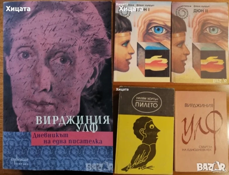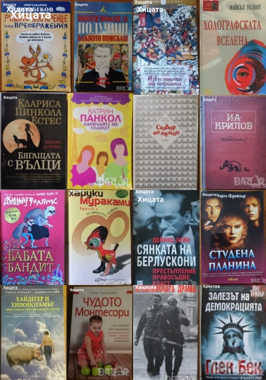 Краят на XX век и краят на модерната епоха,Джон Лукач -30лв.Басни,Езоп -20лв.И страж да бди на пост,Харпър Ли, Нова -20лв.Антология на българския смях,Вихрен Чернокожев и Росица Чернокожева,,1995г.356стр. - 40лв Някои го предпочитат смешно.Сборник американски хумористични разкази,,2005г.400стр. - 30лв Дебела антология на адски смешното фентъзи.Майк Ашли,2003г.464стр. - 50лв. Един смахнат свят,Сериозно комично фентъзи.Майк Ашли,,2003г.496стр. - 50лв.Островът от предишния ден,Умберто Еко - 25лв. Духът на лъва,Дайсаку Икеда, Аксиния Джурова -20лв. В търсенето на Атлантида .Когато небето падна,Ранди и Роуз Флем-АТ - 40лв.Книга за майката,Христо Михов - 25лв.Дийн Кунц : Убежище - 10лв.Вуду - 10лв.Драконови сълзи - 10лв.Полунощ - 20лв.Невинност - 20лв.Пол Дохърти:Египетски загадки. Книга 2: Храмът на Хор - 25лв. Египетски загадки. Книга 3: Жертвите на Анубис - 25лв. Египетски загадки. Книга 4: Убийците на Сет- 25лв. Чашата на призраците - 25лв..Силата на намерението,Уейн Дайър - 80лв. Бъди господар на живота си Уейн Дайър - 70лв.Как да забогатеем докато спим, Бен Суитланд-30лв. Любов, медицина, чудеса, Бърни Сийгъл - 30лв.Цивилизованото поведение.Обноски, морал и етикет на демокрацията,Стивън Картър-30лв. Енеаграма,Хелън Палмър-60лв. 101 урока за живота,Питър Макуилямс -50лв.Едно желание може да промени вашия живот, Гал Едем Сасон,Стив Уенстийн -50лв.Хиромантия за начинаещи,Ричард Уебстър - 30лв. Един смахнат свят,Сериозно комично фентъзи- 50лв.Сватбена нощ,Софи Кинсела-45лв. Антология на Фън Шуй, Джейми Лин- 20лв. Как да лъжем красиво,Олга Белякова - 50лв. Повелителите на Руните. Том 2: Вълчето братство,Дейвид Фарланд - 30лв. Брандо зад кулисите, Даруин Портър - 30лв. Бразавил бийч,Уилям Бойд - 30лв. Светът на Софи. Роман за историята на философията,Юстайн Гордер - 70лв. Всичко на масата,Чарлс Буковски - 15лв. Ф. Пол Уилсън: Отвличане - 15лв.Ф. Пол Уилсън:Пазителят на меча - 10лв.Неандерталец,Джон Дарнтън - 15лв.Кръв и диаманти,Стивън Ледър - 15лв.Бягащата с вълци,Клариса Пинкола Естес,Бард,2001г.592стр.Отлична! - 18лв.Наричайте ме,Скарлет Катрин Панкол,Колибри,2013г.432стр. - 15лв. Рижото магаренце,или преображения.Книга за новия живот, който никога не е късно да започнем,Мирзакарим Норбеков,Александър Дорофеев,2006г.190стр. - 18лв Винаги можеш да получиш каквото поискаш,Фил Мъри,,1998г.176стр. - 18лв Дюн.Книга 1-2,Франк Хърбърт,Георги Бакалов,1987-89г.842стр. -30лв. Пилето,Уилям Уортън - 12лв.Смъртта на еднодневката, Вирджиния Улф - 12лв. Дневникът на една писателка,Вирджиния Улф,Enthusiast,2019г.608стр.Отлична! - 20лв.Басни,И.А.Крилов,Народна просвета,1951г.111стр.Художници:Каневски,Гончаров,Баюскин,Константинов,Моор,Илин,Могилевски,Милашевски,Ечеистов,и др.Всяка басня-отделен художник! Много запазена! - 40лв Сговор на глупци,Джон Кенеди Тул,Народна култура,1989г.432стр.Отлична с леки забележки! - 20лв Изкуството на войната.Древни китайски трактати,Труд,2005г.496стр. - 25лв Холографската Вселена,Майкъл Толбот,Изток-Запад,2003г.512стр. Отлична! - 25лв Бабата бандит, Дейвид Уолямс,Дуо Дизайн,304стр. - 25лв. Хроника на птицата с пружина,Харуки Мураками,Колибри,2007г.680стр. - 20лв Чудото Монтесори или учение без мъчение и възпитание без оценки, награди и наказания,Елена Тимошенко,Асеневци,2015г.238стр. - 20лв. Домашен съветник.Семейно съкровище,Калпазанов,1995г.232стр.Отлична! - 16лв Хайдегер и хипопотамът пристъпват през Перлените порти,Томас Каткарт,Даниъл Клайн,Екслибрис,2009г.254стр.Отлична! - 30лв Как бързо и лесно да с