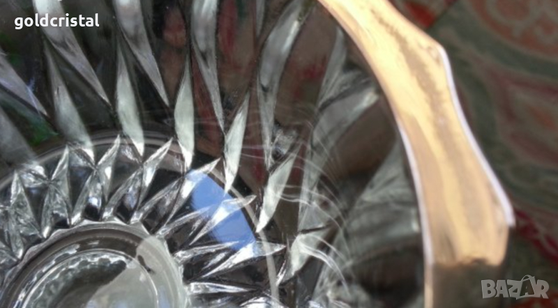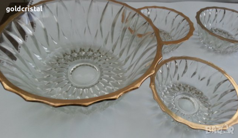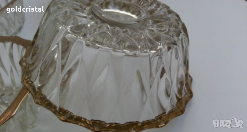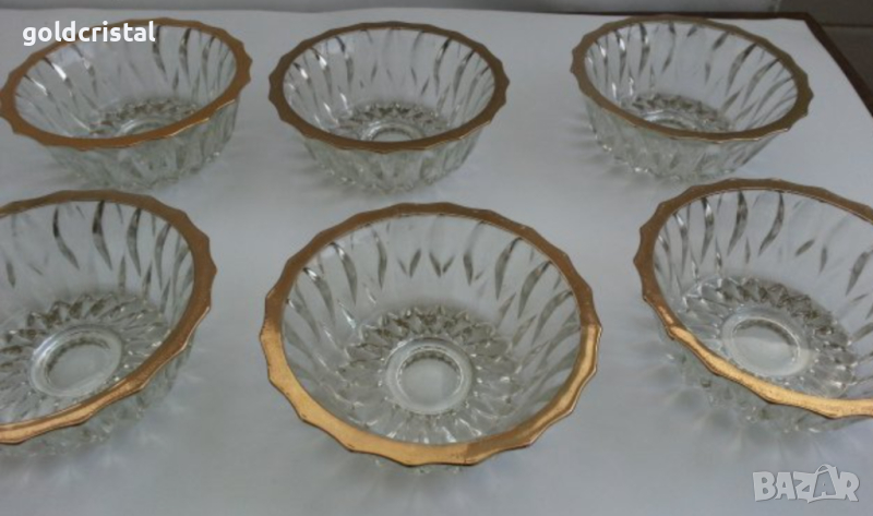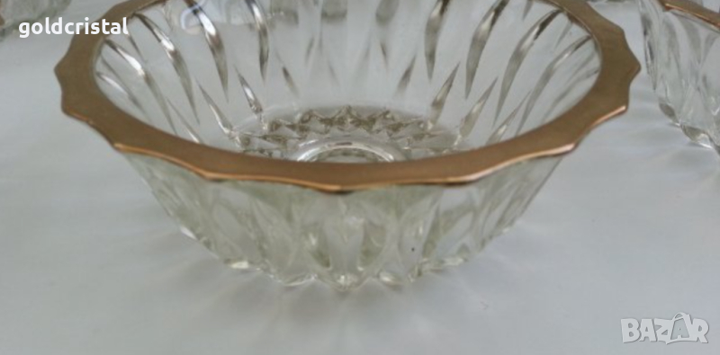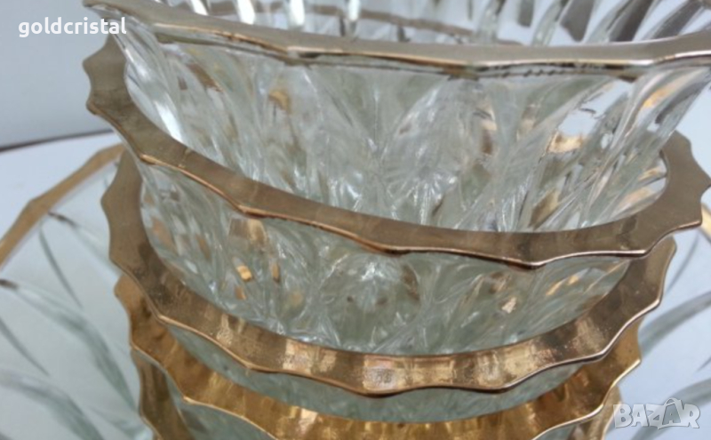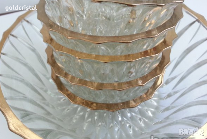 Ретро кристални купички 6 бр с златен кант позлата и една голяма купа фруктиера без забележки стар ретро старинен арт декор винтидж колекция комплект сет лот стари антикварни предмети обзавеждане за дома и семейството подходящи за подарък за ценители и колекционери