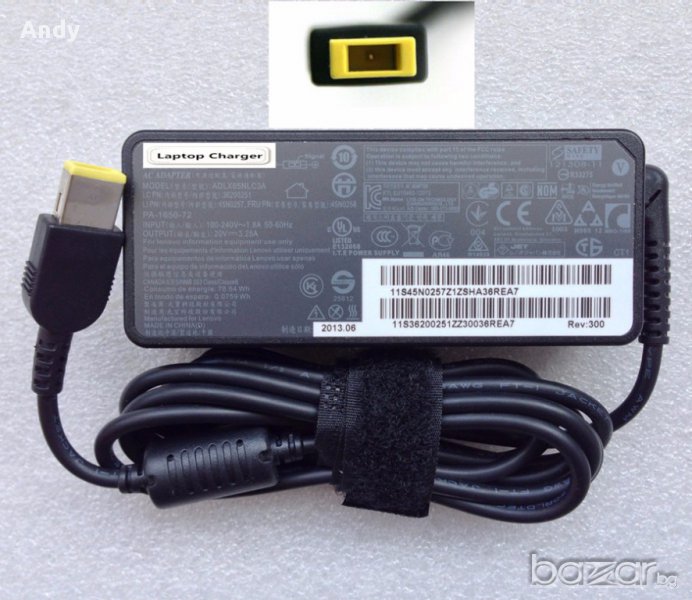 Зарядно устройство, жълта правоъгълна букса 65W 20V, 3.25A перфектно - 29лв.