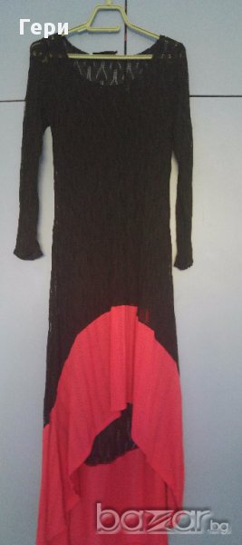 Рокля на Карамела фешън в две части - плетена в цветове черно и корал и рокля от трико по тялото, която може да се носи и отделно. Роклята е асиметрична в най-дългата част е 142 см., подходяща е за по-висока дама - аз съм висока 158 см. и затова не е ползвана.