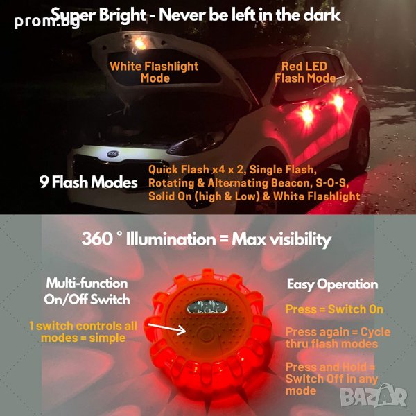 Приложение: за кола, камион, лодка, по време на колоездене, туризъм, строителна дейност или всякакви дейности на открито. С кука и магнит за закачане. Работи на батерии: 3 батерии ААА Диаметър: 100 мм Размери 12.5 x 11.2 x 10.7 cm. Напрежение: 3,6 V. Mощност: 2w