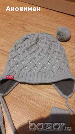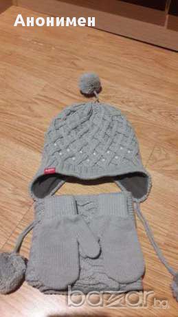 Много красив и мек комплект от шапка, шал и ръкавички на Kitti. Сив на цвят, отпред на шапчицата има пришити бели перлички. Отвътре е с топло поларче. Комплектът е в отлично състояние, без следи от носене. Плетката е здрава и стегната. Обиколката на шапката е 40 см. в неразтегнато състояние. За момиченце на 1,5-2 год., може и по-голямо.