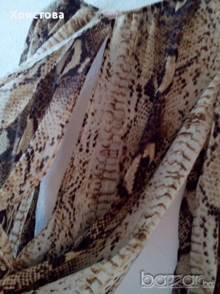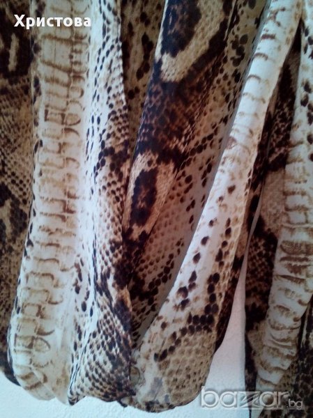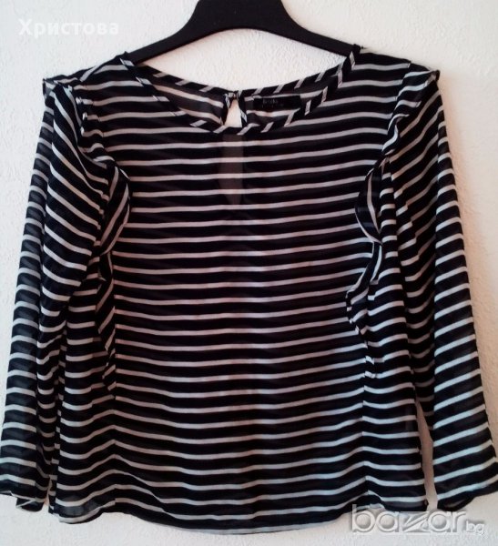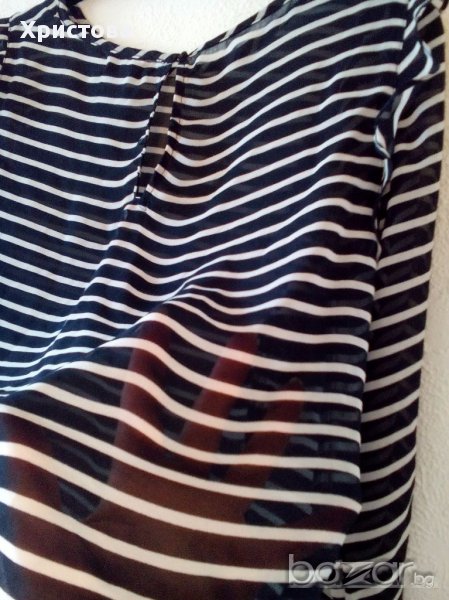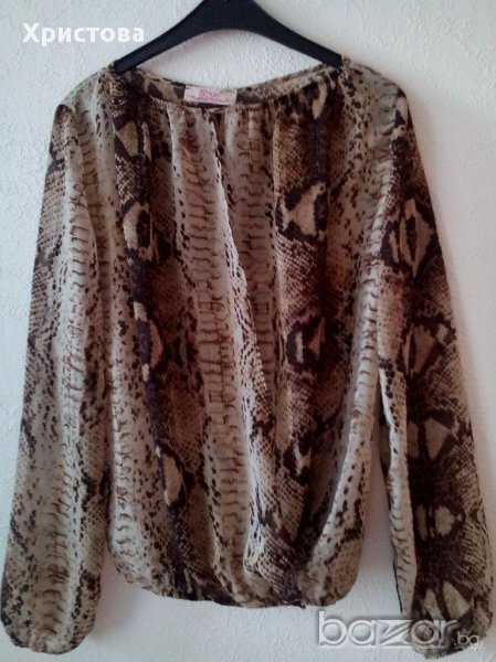 1.Ефирна блуза в бежово-кафяво с животински принт,дълъг ръкав и много интересна кройка с отворени предна и задна част-с дълбоко прихлупване.Размер S.Дължина 57см,бюст около 104 см-разпънато,дължина ръкав 59см,при ластик долу 54до 102см.Обличана веднъж.Цена 12лв.2.Черно-бяла къса свободна блуза в хоризонтално райе,със 7/8 ръкав,,по етикет L,но по-скоро е M/L.Дължина 53см,бюст 96см,дължина ръкав 47см.Обличана веднъж.Цена 12лв.Не разменям.При комбиниране с друг артикул от моите обяви- отстъпка.
