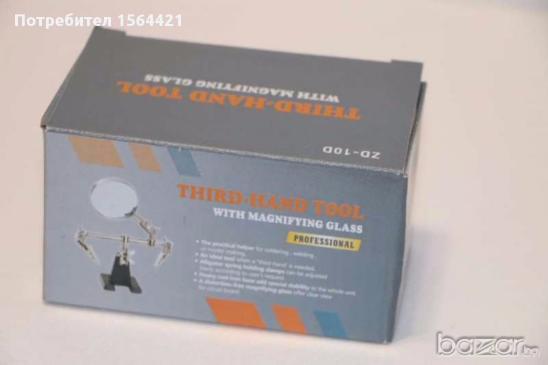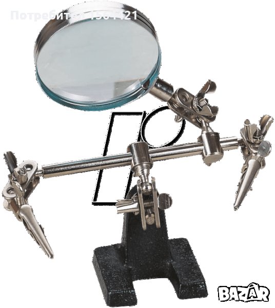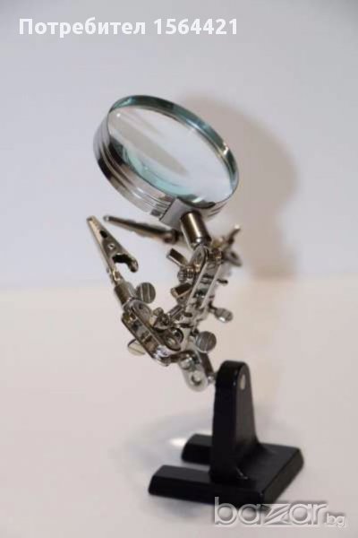 професионална стъклена лупа "Помощна ръка", 3х, 60 мм, немска, внос от Германия. С шест сферични шарнира. Захващащите рамена могат да бъдат преместени, в зависимост от нуждата. Стъклото е с лупа 3 диоптъра с метална рамка. Има две подвижни скоби за сигурно захващане. Високо качество. Тегло 400 гр.