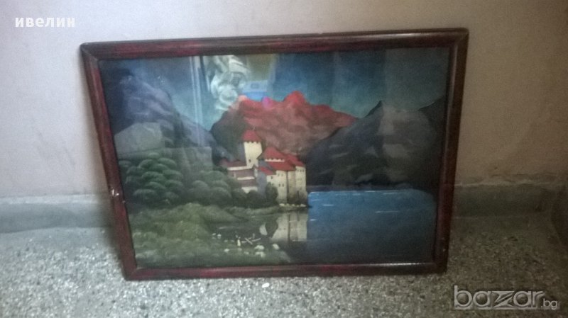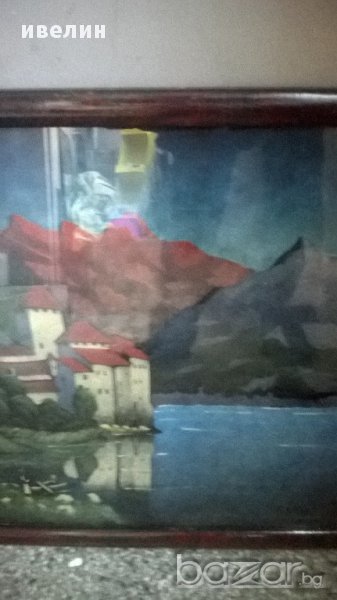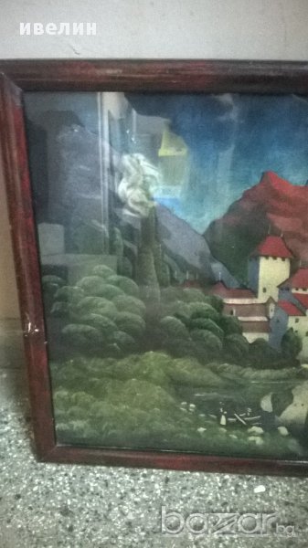 стара картина-пейзаж.рисувана на коприна/сатен/.дървена рамка със стъкло.размери 42см/57см.