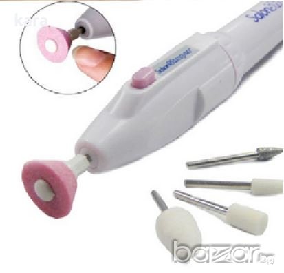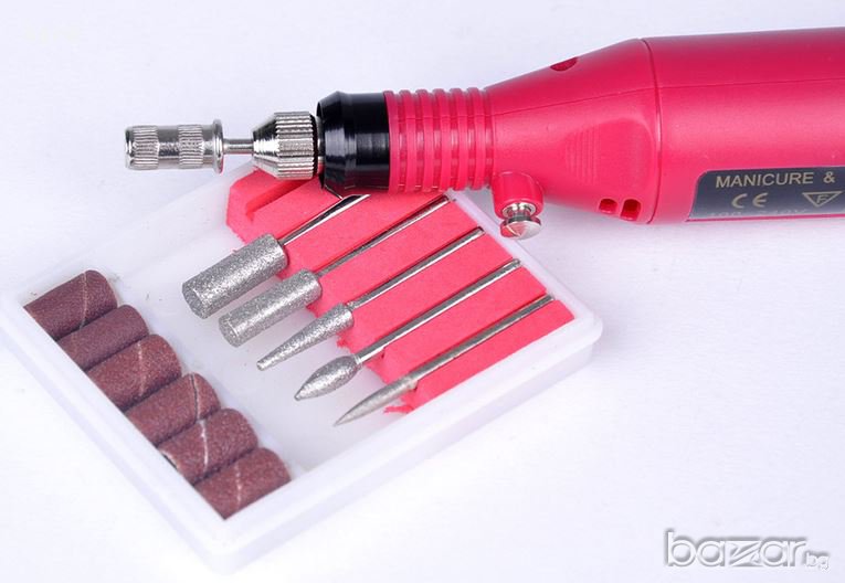 Миниатюрна дрелка-пила с 5 прецизни накрайници в чантичка като маникюрно-педикюрен набор. Дрелката е с дължина 16 см и захранване от 2 батерии тип АА (не влизат в комплекта). С висока скорост и достатъчно мошна за чисто обрязване и формиране на акрили,кутикули и нокти