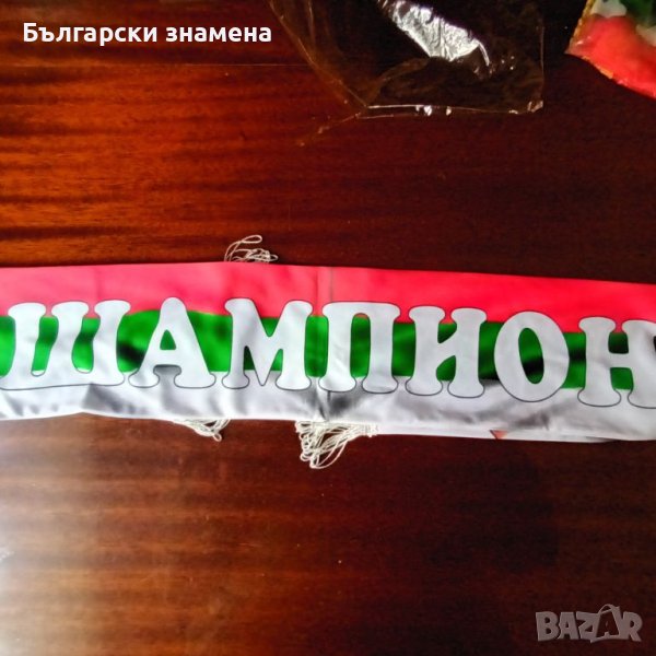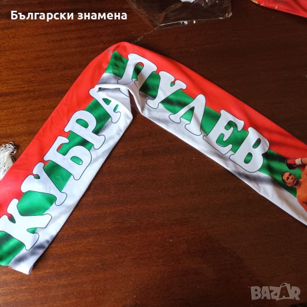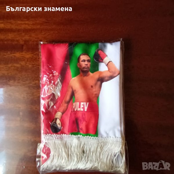 От едната страна е името на Кубрат Пулев на фона на българското знаме и 2 лика долу с двата края а отзад пише шампион.Полиестерна коприна