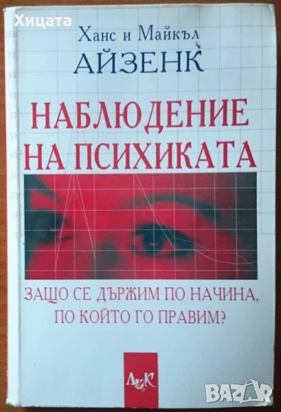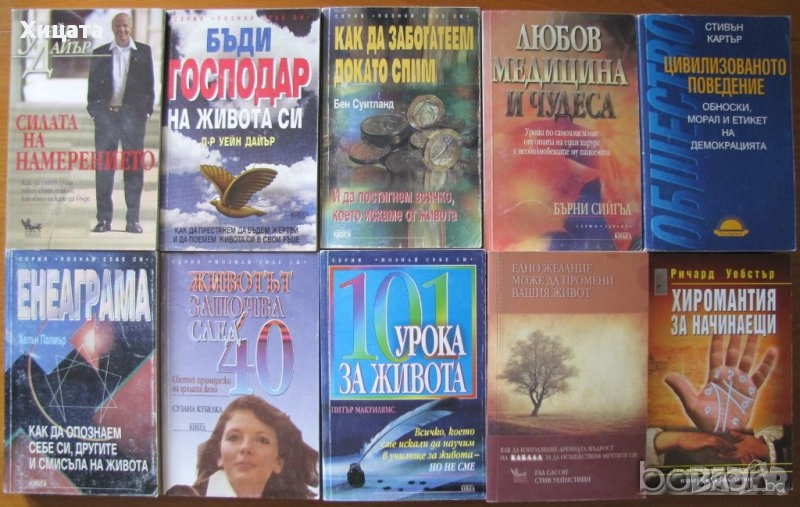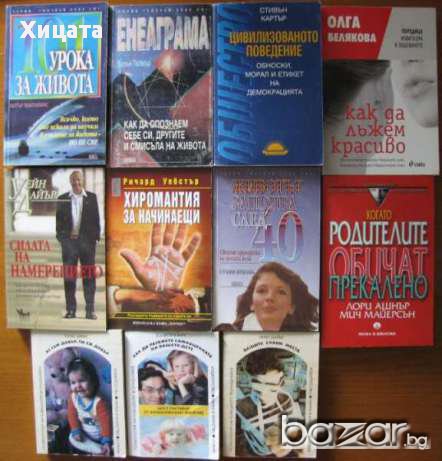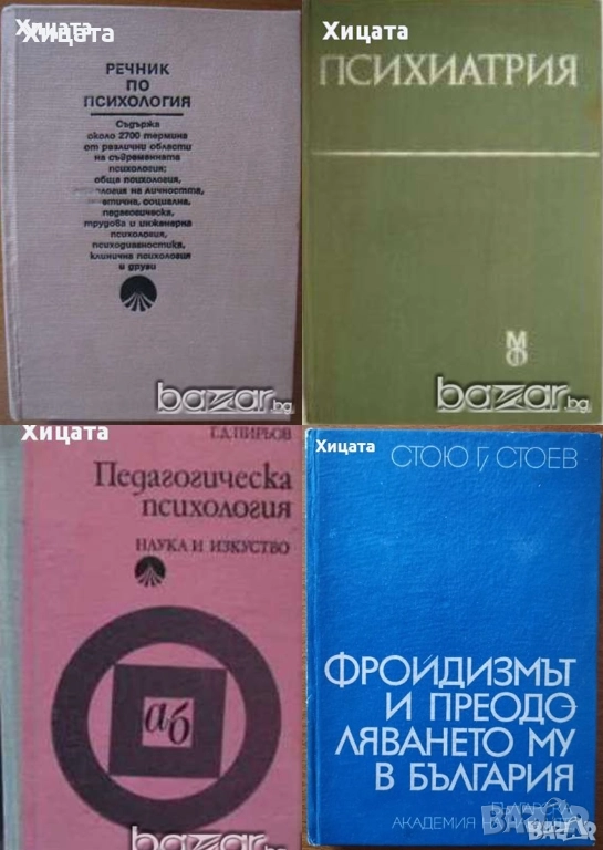 Хармония отвъд ума.Книга за баланса,Елена Шахънска,Self-Help,2014г.396стр.Отлична! - 60 евро. Психографология.Наука за определяне на душевния свят на човека по почерка,И.Ф.Моргенщерн,Логос Алфа,1999г.320стр. - 60 евро Свръхестественото,Греъм Хенкок,Бард,2014стр.608стр.Нова! - 50 евро . Едноизмерният човек.Изследвания върху идеологията на развитото индустриално общество,Херберт Маркузе,Христо Ботев,1997г.360стр. - 60 евро Ерос и цивилизация,Херберт Маркузе - 15 евро Ще го видиш,когато повярваш в него,Уейн Дайър,Наука и изкуство,1996г.396стр. - 40 евро .Силата на намерението,Уейн Дайър - 40 евро. Бъди господар на живота си Уейн Дайър - 40 евро .Мъдростта на вековете,Уейн Дайър - 25евро Наблюдение на психиката.Защо се държим по начина, по който го правим?,Ханс и Майкъл Айзенк,Лик,2005г.416стр.- 50евро. Две студии по аналитична психология,Карл Густав Юнг,ЕА - Евразия-Абагар,2004г.384стр.Отлична! - 40 евро Педагогическа психология.Психопедагогика,Проф.Любен Десев,Аскони-Издат,2000г.516стр.- 80 евро. Речник по психология,Любен Десев,Булгарика,2003г.меки корици - 95 евро ;2010г.656стр. 6-то поправено и допълнено издание,твърди корици - 110 евро. Психология на творчеството. Теоретични проблеми, емпирично изследване, креативни задачи,Любен Десев, Салех Брик, Никола Десев,Парадигма,2011г.446стр. - 110 евро. Зигмунд Фройд:Естетика, изкуство, литература - 45 евро ;Анатомия на чувствата - 30 евро. Въведение в психоанализата - 13евро; Тайната на живота - 20евро ; Неврозите-18 евро Тълкуване на сънищата - 18 евро; Детската душа- 18 евро;Отвъд принципа на удоволствието-12 евро ; Сън и сънища -20 евро; Психология на сексуалността- 13 евро; Аз съм добър, ти си добър- Томас Харис-25 евро ;Как да развиете самооценката на Вашето дете-Д-р Бети Б. Янгс- 25 евро ; Когато родителите обичат прекалено-,Лори Ашнър, Мич Майерсън - 30 евро; Вашите слаби места- Уейн Дайър-11 евро.Да излекуваме тревожността, депресията и стреса -Давид Серван-Шрайбер - 35 евро. Психология и психодиагностика на интелигентността,Генчо Пирьов - 35 евро . Модел за личност -20 евро.Психологията на бъдещето ,Станислав Гроф - 45 евро.Анатомия на човешките отношения, М. Аргайл, М. Хендерсън-25 евро.Фройдизмът и преодоляването му в България,Стою Г.Стоев,БАН,1969г.238стр. - 20 евро.Сексуалността при децата и младежите,Хайнц Грасел, Курт Бах - 20 евро;Психология. Учебник за студентите от ВИФ "Г. Димитров". Медицина и физкултура, 1990г. Н. Попов; Б. Първанов- 30 евро.Основи на психичното лечение,Даян Стейн - 30 евро.Енциклопедия на смъртта 1-2 том ,Александър Лаврин - 45 евро.Психиатрия,Христо Христозов, Тодор Ташев и др.Медицина и физкултура,1988г.248стр. - 35 евро. Речник по психология , Наука и изкуство,1989г.744стр.- 40 евро. . Педагогическа психология ,Генчо Пирьов, Любен Десев и др.Наука и изкуство ,1977г.468стр.- 40 евро; Детска психология,Ст.Жекова,Цв.Асенов,П.Николов,Народна просвета 1977г.328стр. - 20 евро; Парапсихологията - наука или магия?,Джеймс Алкок,Наука и изкуство ,1986г. - 25 евро ; Нервен ли сте?,Зигфрид Шнабл ,Медицина и физкултура,1984г. -15 евро ; Науката за любовта,Джон Бейнс,Екслибрис,1994г. 304стр. - 25 евроТрудните въпроси: Как да говорим с детето за секс, наркотици, алкохол, развод,Майкъл Попкин, Робин Фридман Шпицман,Слънце,2006г. 296стр. -30 евро ; Визуална психодиагностика, Георгий Щекин, Изд.Фабер,2004г.720стр. - 75 евро. Педагогическа психология ,Генчо Пирьов, Наука и изкуство ,1975г.504стр. -30 евро . Удивителни оздравявания,Карил Хиршберг, Марк Ян Бараш, 