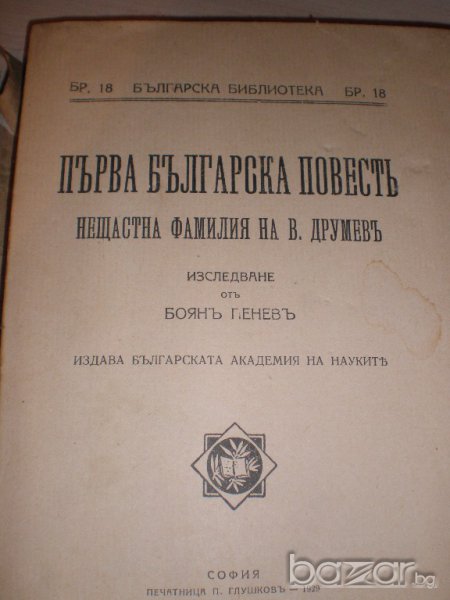 "Нещастната фамилия" Васил Друмев, изследване - анализ на Боян Пенев. Издателство П. Глушковъ. Отпечатана в Лайпциг от Българска академия на науките. Никога не е разлиствана, колите са неразрязани. Меки корици. Корицата е паднала. Не сме я залепили, предполагам, че след покупка ще бъде дадена на книговезко студио.
