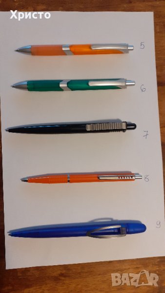Снимки 3 и 4: химикалки 5 и 6 пластмасови и долната част където се държи е гумирана, 7 - с метален клип, 8-метален клип, бутон, ринг и долу при върхът на пълнителя, 9 - метален клип и гумен бутон. Цена 0,25 лв. Ако се издава фактура се начислява ДДС.