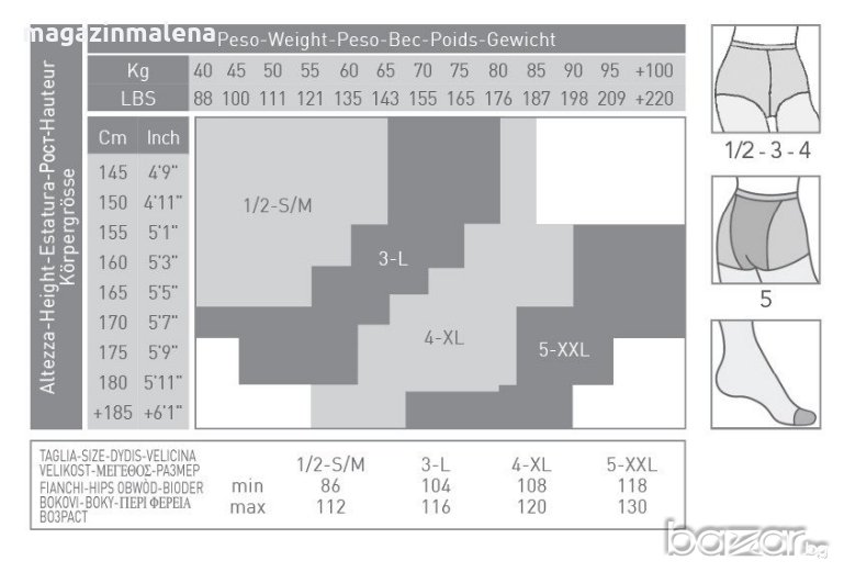 РАЗМЕР 1/2=S/M - 145-167 см и 40-65 кг при ханш 86-112 см; РАЗМЕР 3=L - 155-175 см и 60-75 кг при ханш 104-116 см; РАЗМЕР 4=XL - 160-180 см и 70-85 кг при ханш 108-120 см; РАЗМЕР 5-MAXI=XXL - 165-+185 см и 80-+100 кг при ханш 118-130 см. Избирайки размера, Ви съветваме да следите както килограмите, така и височината по таблицата.
