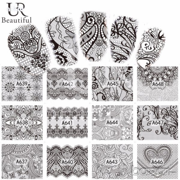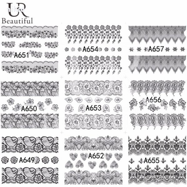 A625-672 48 бр черно бели дантела мрежа татос ваденки водни стикери за нокти маникюр